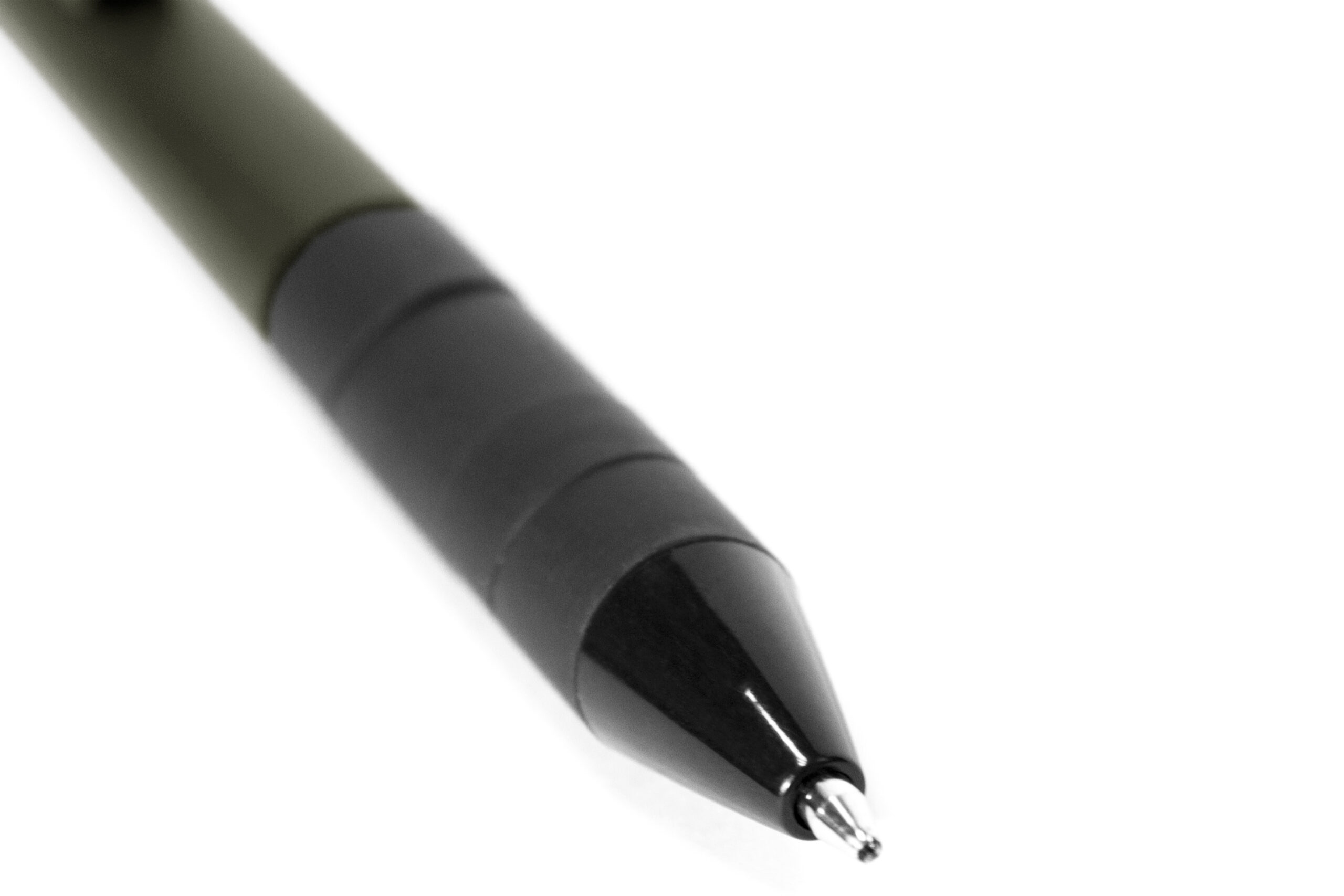 Metálico. Pulsador y puntera de plástico negro. Clip metálico en color negro. Grip de goma negro. Cuerpo de color. Tinta negra.
