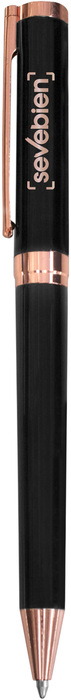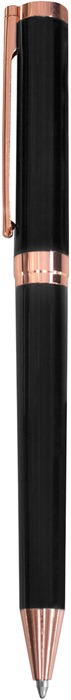 Metálico. Bolígrafo con apertura giratoria. Destape cobre en la parte de arriba. Cuerpo negro. Detalles en clip, arco circular y punta color cobre. Tinta negra. Presentación en estuche con cierre magnético.