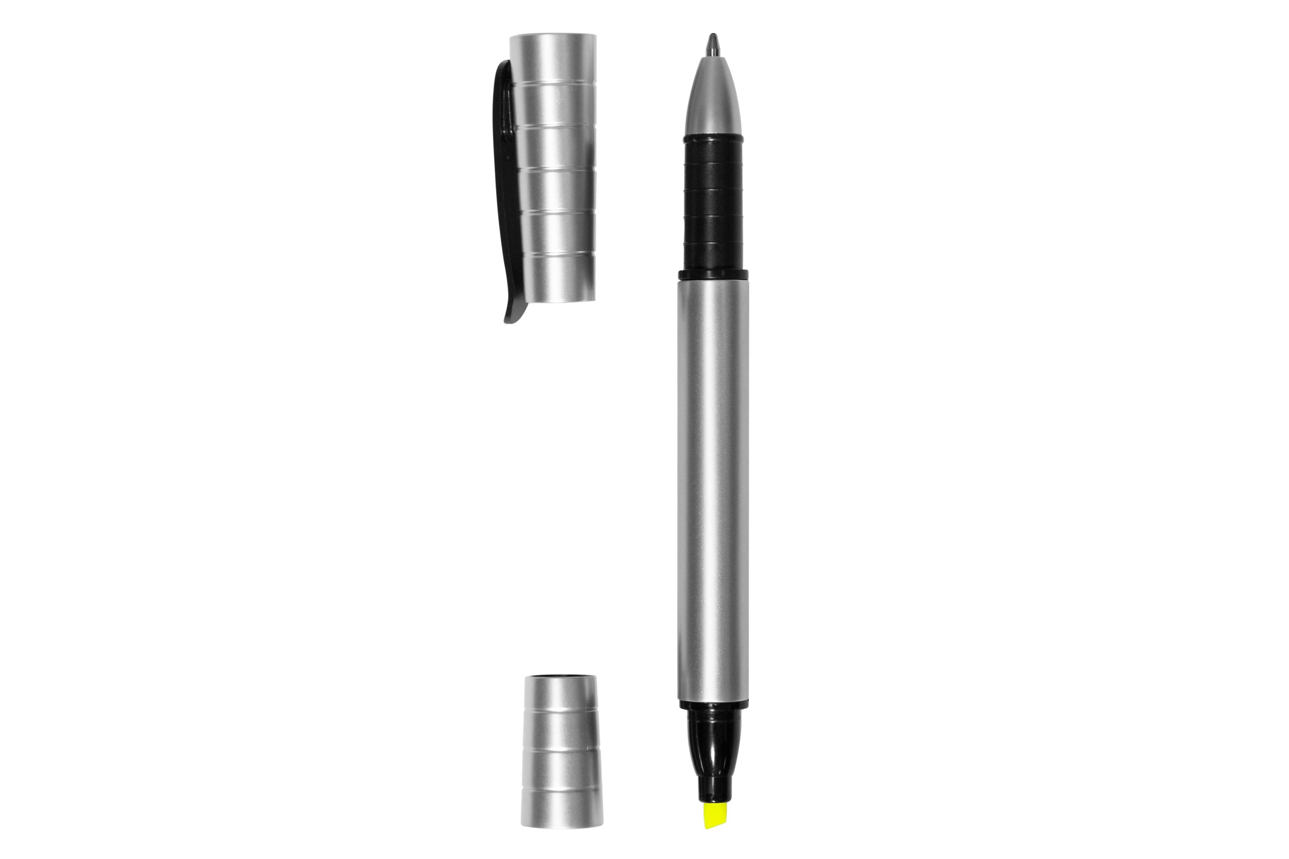 Plástico. Con tapa. Detalles en color negro. Resaltador fluo amarillo. Tinta negra.