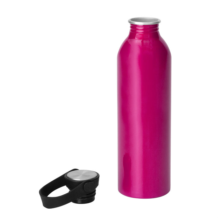 Hidratación a la mano.Botella de aluminio con acabado brillante. Tapa a rosca de acero inoxidable 201 y Polipropileno, con tira de silicona color negro.Medidas: Ø 6,5 x 23cm.