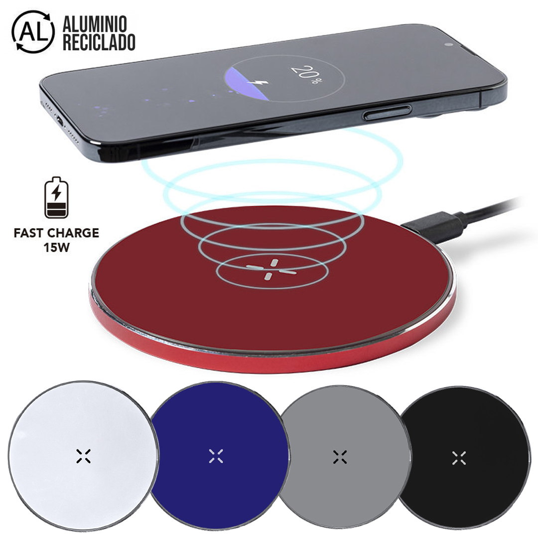 Cargador inalámbrico 15W de diseño circular. Fabricado en aluminio reciclado, con posibilidades de reciclaje casi infinitas, sin perder sus propiedades originales y consumiendo menos energía en este proceso. Compatible con dispositivos equipados con tecnología de carga inalámbrica Qi. Base antideslizante, con cable cargador Tipo C incluido, y disponible en variada gama de colores. Presentado en caja individual de diseño kraft, con manual de instrucciones en español e inglés. Fabricado conforme a los estándares RoHS y en cumplimiento con los siguientes requisitos de seguridad: Sistema de protección contra sobrecalentamiento. Sistema de protección contra sobrecarga. Sistema de bloqueo para evitar cortocircuitos. Inalámbrico 15W