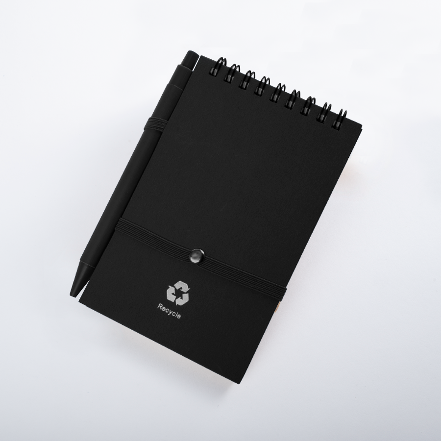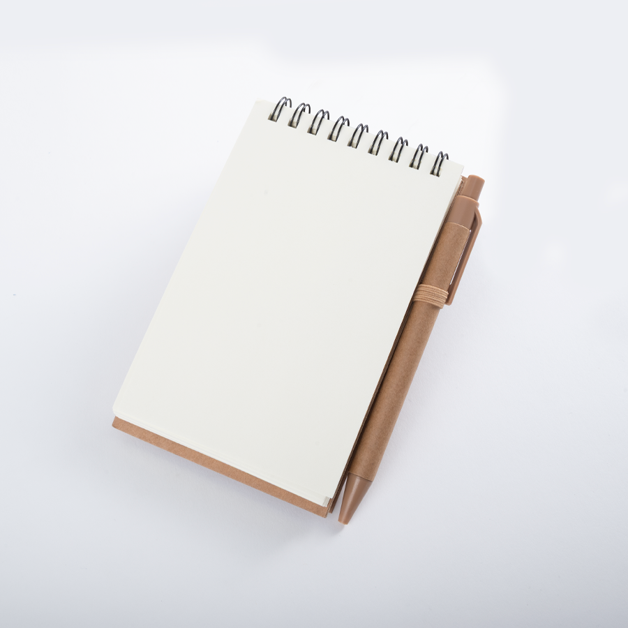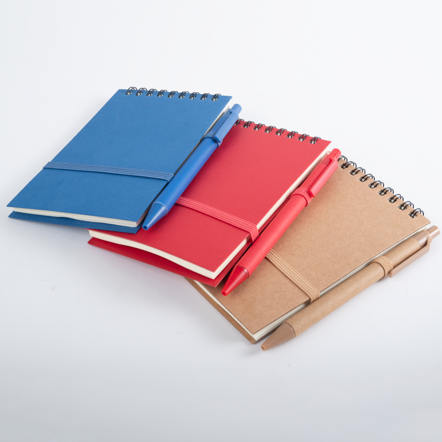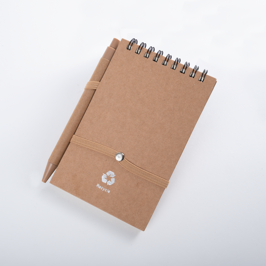 Libreta Ecológica con tapas de cartón reciclado, 70 hojas interiores blancas (croqueras). Incluye cierre elasticado y bolígrafo ecológico.