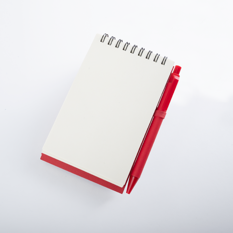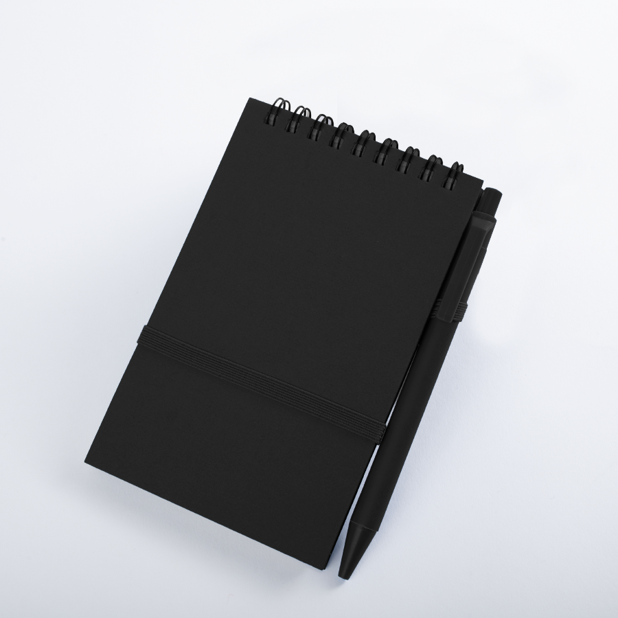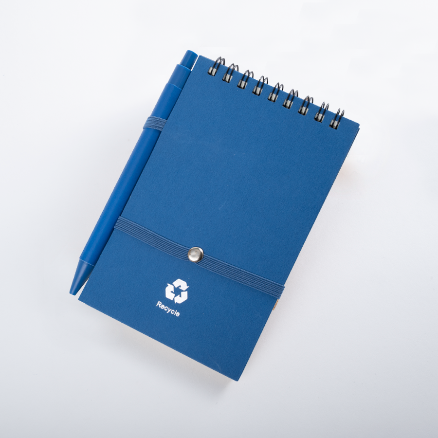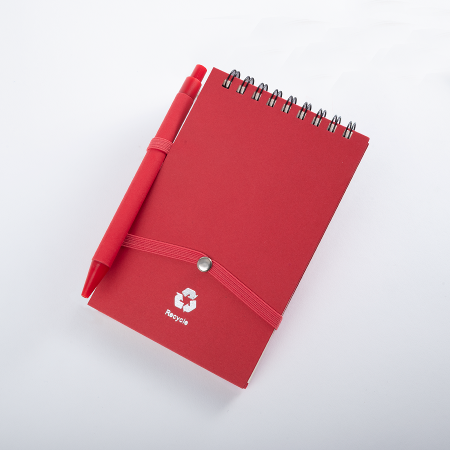 Libreta Ecológica con tapas de cartón reciclado, 70 hojas interiores blancas (croqueras). Incluye cierre elasticado y bolígrafo ecológico.