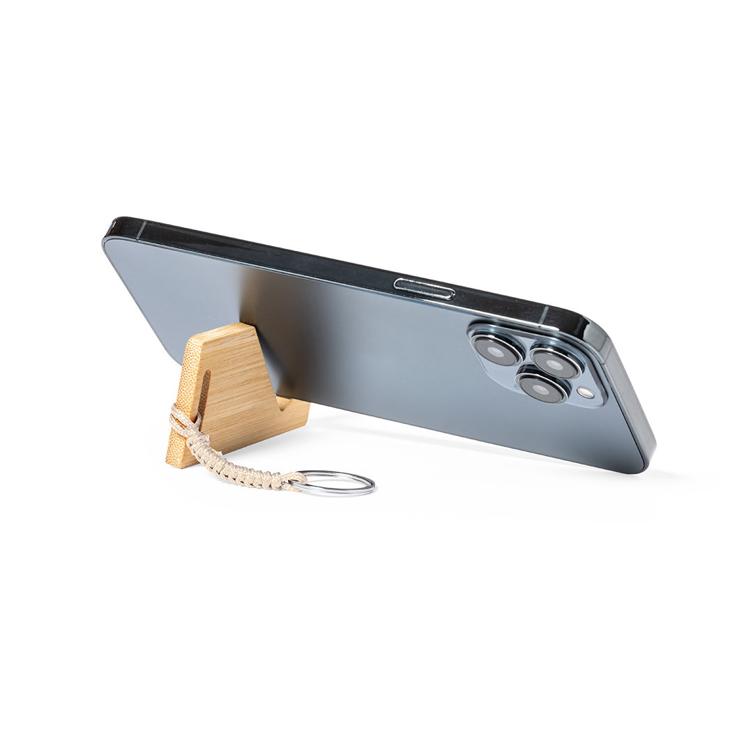 Llavero de línea nature fabricado en bambú, con soporte para smartphone integrado y original cordón. Presentado en bolsita individual con cartón interior eco.