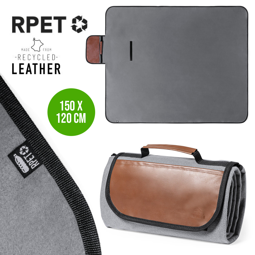 Manta de picnic premium fabricada en resistente poliéster RPET de 160g/m2 y acabado en gris. Plegable y con cierre de velcro solapa y asa en cuero reciclado con ribetes reforzados. En tamaño 120×150 cm, con base aislante en PEVA y lado para sentarse de agradable tacto. De fácil plegado y tamaño compacto, con distintivo cuero reciclado en la solapa. El material RPET se elabora a partir de plástico reciclado, para así fomentar la reutilización de residuos plásticos y ayudar a la sostenibilidad del planeta.El cuero reciclado rescata las fibras desechadas en los procesos de fabricación del cuero, minimizando el desperdicio de material, contribuyendo a reducir el impacto ambiental y manteniendo a la vez sus propiedades originales.