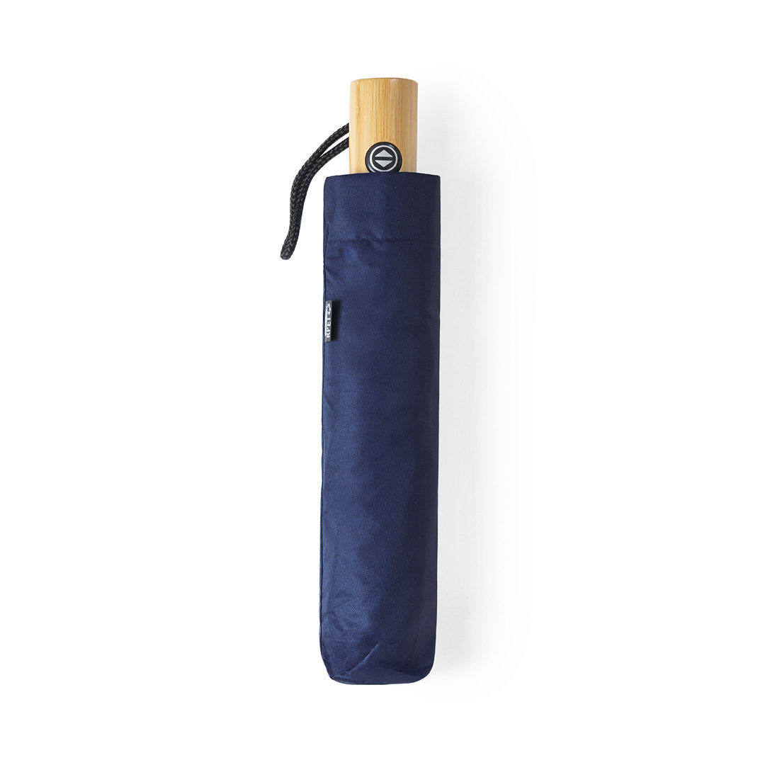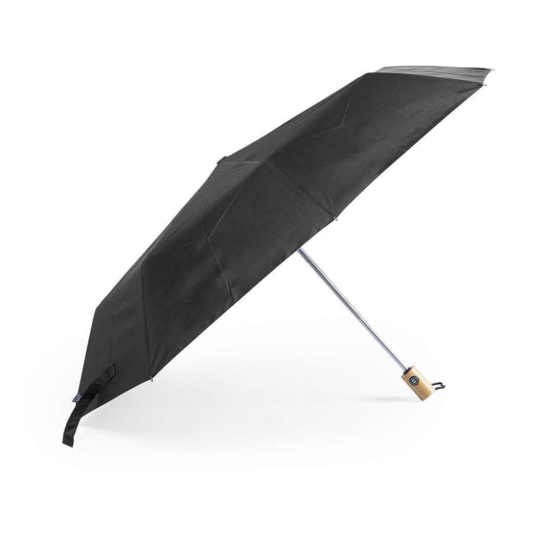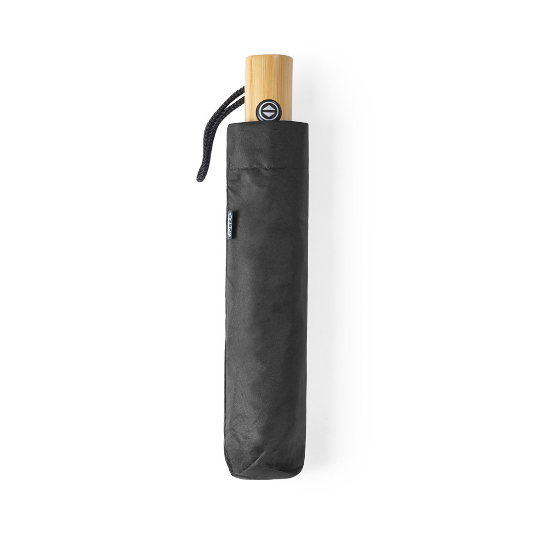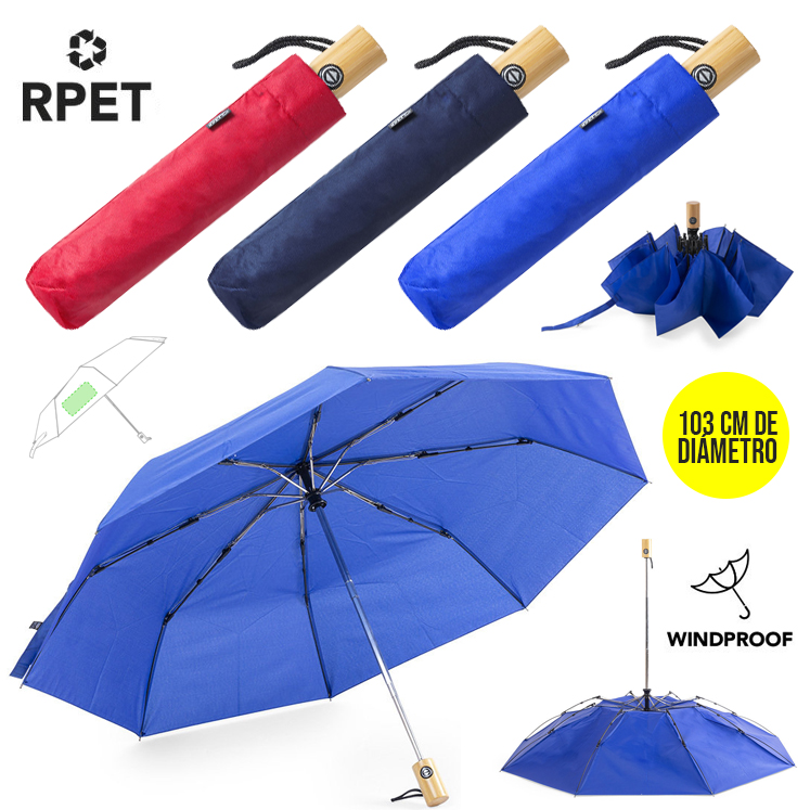 Paraguas plegable de línea nature de 103cm de diámetro. En material pongee 190T RPET, elaborado a partir de plástico reciclado, para así fomentar la reutilización de residuos plásticos y ayudar a la sostenibilidad del planeta. De apertura y cierre automáticos, con mecanismo anti viento y varillas de fibra de vidrio. Mango de bambú con botón, distintivo RPET en etiqueta y disponible en variada gama de colores. Funda RPET a juego incluida. 23″». Apertura y Cierre Automático. Sistema Antiviento. Mango Bambú. Funda Pongee RPET