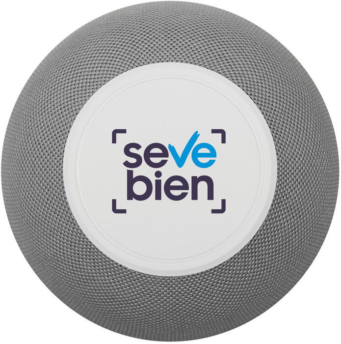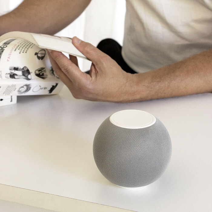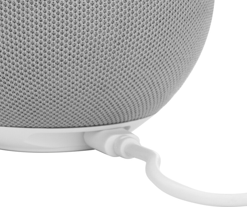 Sonido compacto, fácil de llevar.Parlante Bluetooth. Estructura esférica plástica color blanco y tela rejilla color gris claro. Cable de carga y conexión USB-C en color blanco. Incluye manual de uso.Medidas: Ø 9,6 cm x 8,4 cm.