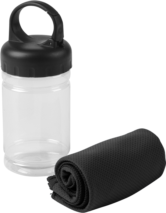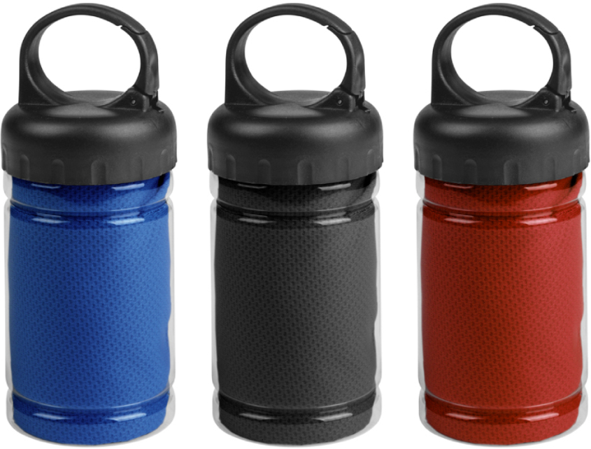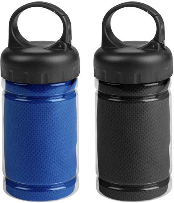 Medidas toalla 79 x 29 cm / Medidas frasco:  Ø6,5 x 17 cm. Políester. Toalla de enfriamiento en un estuche de plástico transparente. Para un efecto refrescante humedezca la toalla con agua o agregue agua en el cilindro e incorpore la toalla. Tapa a rosca con mosquetón.