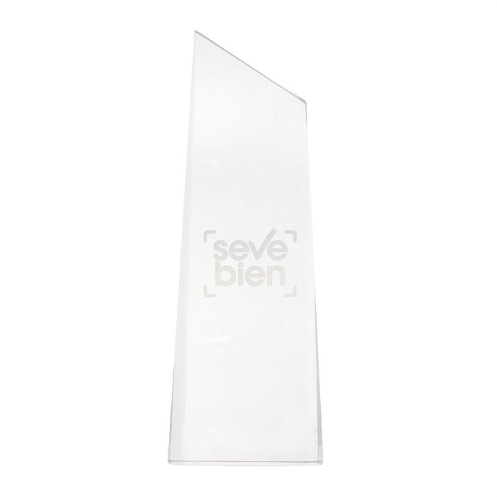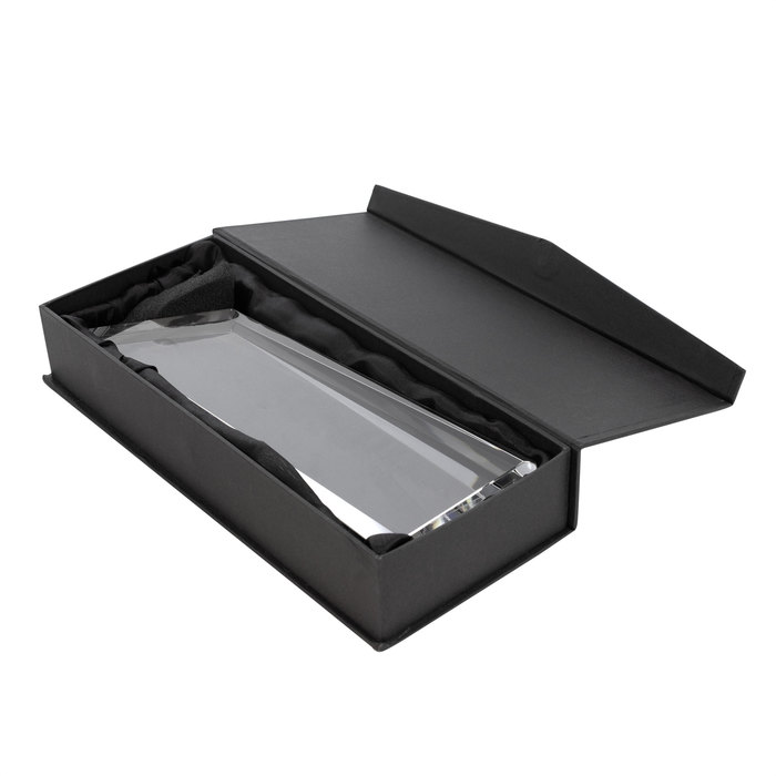 Premia la excelencia.Trofeo de vidrio simil cristal. Presentación en estuche con cierre magnético y envoltorio de papel blanco.Medidas: 24 x 8,5 x3,5 cm.